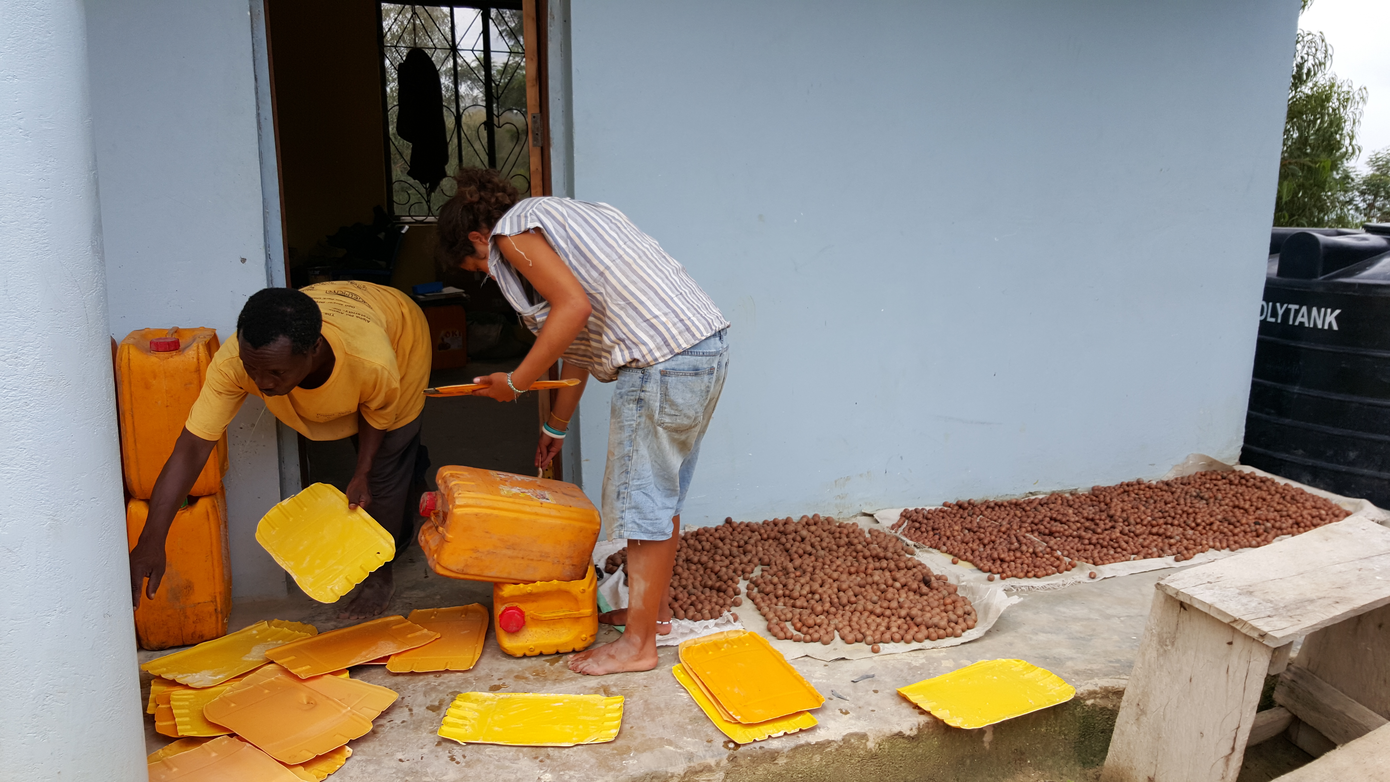 Nå haster det for utplanting og oppal av Macadamiatrær. Nøttene vi samlet fra landbruksuniversitetet i mars/april i fjor hadde råtnet og få var spiredyktige. Dessuten viste det seg at lokale maur var særdeles glupske og dyktige til å fortære spirene på de få kg resterende nøtter rett i etterkant etter skallet sprakk under oppal. Derfor skal oppal skje i avsagde plastkanner for matolje satt opp på stativ for å hindre at maurene skal komme fram til nøttene.