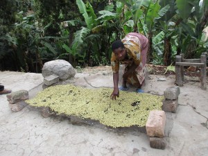 En kvinnelig produsent tørker kaffen på forskriftsmessig måte på et nett med lufting under på et tørt område