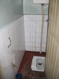 Ståtoalett på pensjonatet. Dusjing i naborom med oppvarmet vann fra bål som helles over hodet fra bøtte.