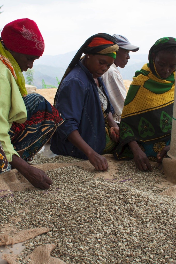 Kaffebønder sorterer kaffebønner av høy kvalitet. Kaffen pakkes i fine tøyposer og har blitt solgt i Norge før jul