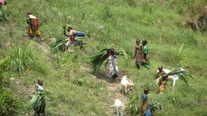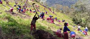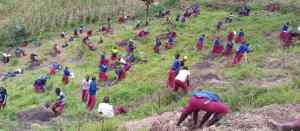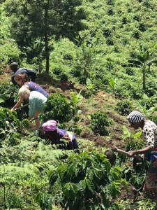 Norske venner i samarbeid med lokale kvinner om å luke mellom kaffeplantene på Dalen-feltet.