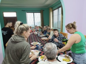 Frokost med livlige samtaler i oppholdsrommet før dagens aktiviteter.