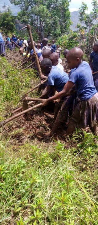 Elever fra barneskolen i Lukunguni rydder jord for å så mais