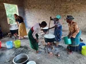 Foreldrene ved Luale barneskole har organisert seg i grupper for å fordele arbeidet med å lage skolemat, her ugali – maisgrøt. En elev fra Sagavoll bidrar ivrig med å røre i kjempegryta
