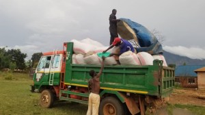 Vår oppofrende bilreparatør og sjåfør Shabani oppreist på taket av lasset av hønsemøkk til bruk i kaffeproduksjonen. Jorda i Mgeta er ofte utarmet og mye gjødsel trengs for å få gode avlinger.